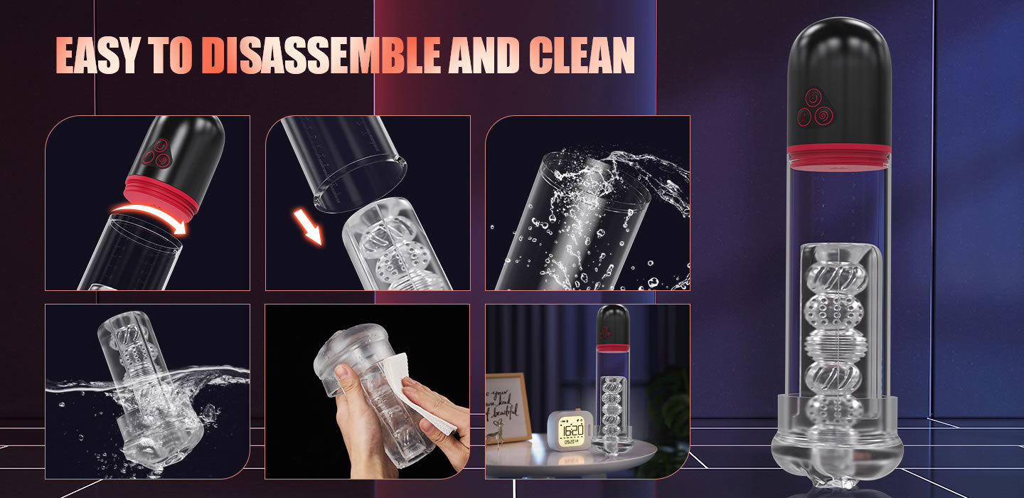 Carefully designed, there are two buttons in charge of sucking. The threaded button is for 3-frequency sucking, from strong, normal to weak. Click this button and it will follow a certain intensity to continuously suck your dick until it is clicked again to pause. And the button with the arrow symbol is responsible for controlling 9 patterns of cyclic sucking. You are free to find the most exciting mode that pleases you the best without worrying about the discomfort caused by excessive sucking. Moreover, the clear silicone sleeve which is shaped into 6 connected hollow balls will bring you an incredible sense of wrapping and scratching. And you can clearly observe how majestic your penis becomes through the transparent cylinder and the measurements on one side of it throughout the whole process! And it’s easy for disassembling to clean, but please note that the black motorized part is not waterproof.